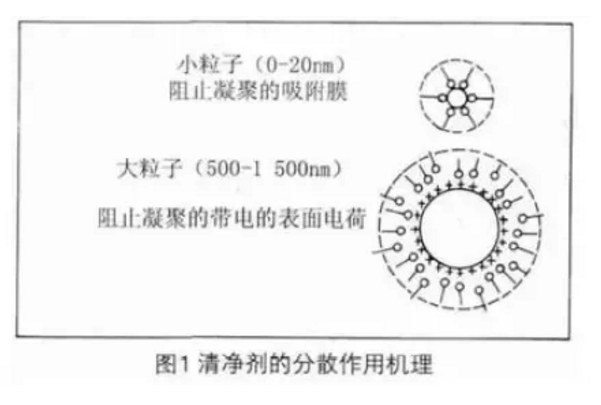 分散作用又可稱為懸浮或膠溶,即清凈劑能將已經(jīng)形成的漆膜、膠質(zhì)和積炭等固體小顆粒加以吸附,在其表面形成一層覆蓋膜而分散在油中,阻止這些非油溶性顆粒聚集成較大的顆粒沉積或黏附于氣缸上。清凈劑的分散作用機(jī)理見(jiàn)圖1。