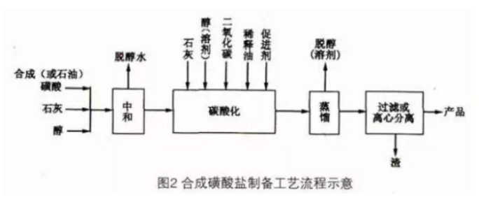 按合成途徑分,以潤(rùn)滑油餾分作為原料生產(chǎn)的磺酸鹽為石油磺酸鹽;而以各種合成烷基苯為原料生產(chǎn)的磺酸鹽為合成磺酸鹽。石油磺酸鹽是以相對(duì)分子質(zhì)量為380的潤(rùn)滑油餾分為原料。合成磺酸鹽的制備(以鈣鹽為例)是以生產(chǎn)12-烷基苯的副產(chǎn)物重烷基苯或烯經(jīng)與苯烷基化制得的合成烷基苯為原料,然后用發(fā)煙硫酸或So3進(jìn)行磺化,得到石油磺酸或合成磺酸;再用石灰與磺酸反應(yīng)(金屬化)生成中性磺酸鈣鹽;最后碳酸化,在醇類促進(jìn)劑存在條件下,加入石灰并通入二氧化碳,得到中堿值或高堿值磺酸鈣鹽。合成磺酸鹽的制備工藝流程見(jiàn)圖2。