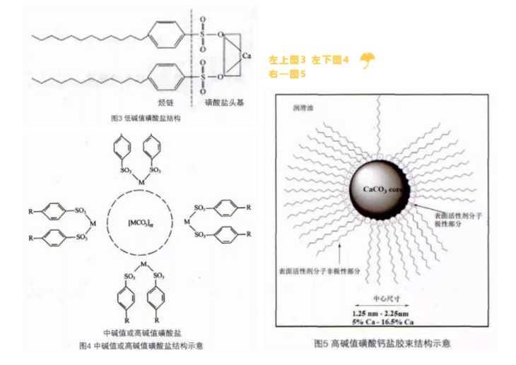 低堿值磺酸鹽中的油溶性烷基為C18~C20或以上,對(duì)油有充分溶解性的磺酸分子量在450以上。高堿值磺酸鈣鹽是通過(guò)將過(guò)剩的堿以碳酸鈣的形式分散在膠束中,形成高堿性磺酸鹽。以碳酸鈣的形式分散的鈣鹽與磺酸鹽的鈣鹽之比超過(guò)30:1。